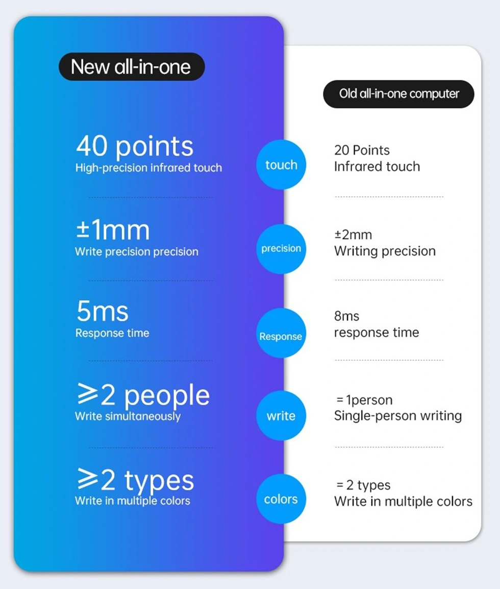 A fejlett infravörös érintéstechnológia elősegíti a zökkenőmentes együttműködést rendkívül érzékeny és pontos érintési interakcióval. Támogatja a többfelhasználós együttműködést 40 érintési ponttal és intuitív kézmozdulatokkal a nagyításhoz és a navigáláshoz. A technológia testreszabható tollbeállításokat és bővíthető munkaterületet is kínál, hogy alkalmazkodjon a különféle szakmai igényekhez.