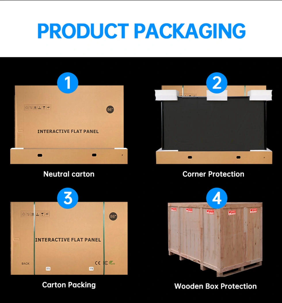 Az interaktív kijelző biztonságosan egy semleges kartondobozba van csomagolva, megerősített fadobozvédelemmel a biztonságos szállítás érdekében.