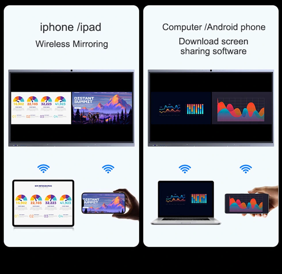 Ez a kábel nélküli megoldás széles körű eszközkompatibilitást és éles, szinkronizált vetítést kínál. Többfelhasználós képernyőmegosztást tesz lehetővé interaktív fordított vezérléssel a videók, zenék és dokumentumok zökkenőmentes megosztása érdekében.